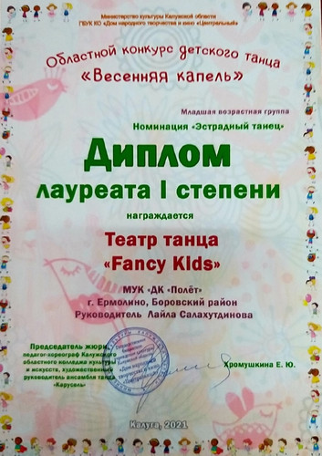 Лауреат I степени Театр танца «Fancy Kids», Руководитель Лайла Салахутдинова., Лауреат 3 степени Народный самодеятельный коллектив ансамбль эстрадного танца «Ритм» младшая группа Руководитель Енина Галина Владимировнаю, Лауреат 3 степени Народный самодеятельный коллектив ансамбль эстрадного танца «Ритм» старшая группа Руководитель Енина Галина Владимировна., Диплом I степени Народный самодеятельный коллектив хореографический ансамбль «Солнышко», Руководитель Дрогова Лидия Алексеевна. Желаем дальнейших творческих успехов!!!!!